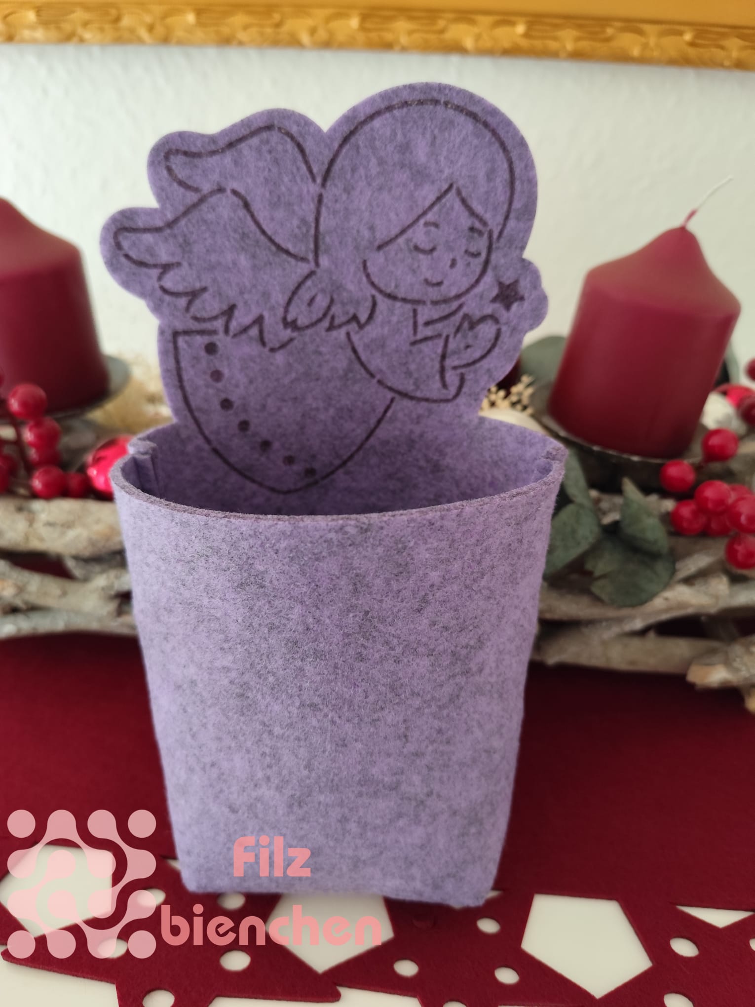 Gefertigt aus 3 mm starkem, hochwertigem Filz (100 % Polyester) überzeugt sie durch ihre feste Form, die zarte Farbe und das detailverliebte Engelmotiv.