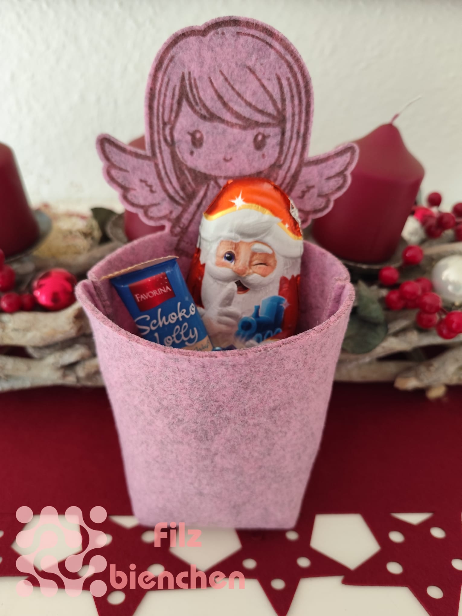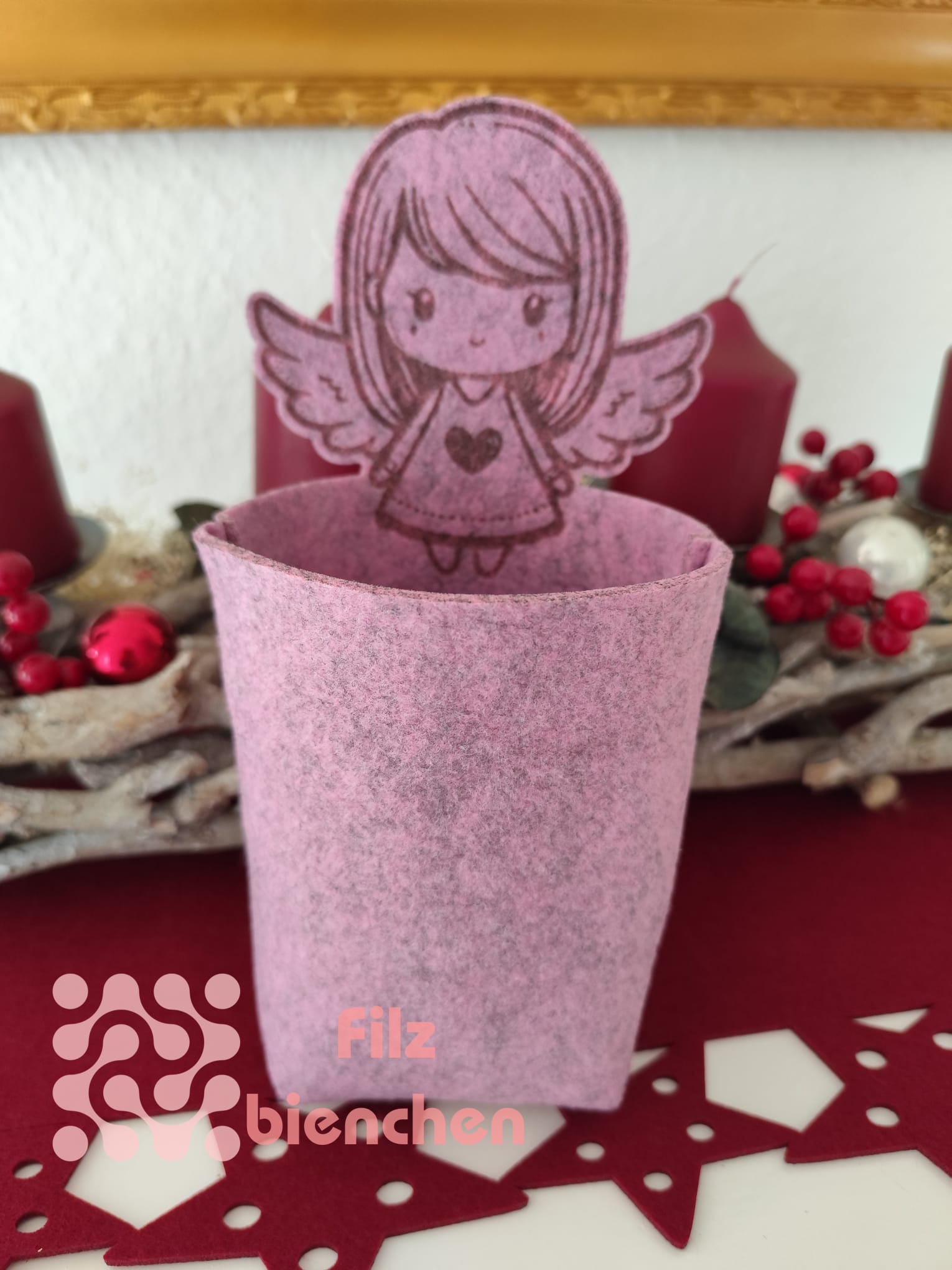 Gefertigt aus 3 mm starkem, hochwertigem Filz (100 % Polyester) überzeugt sie durch ihre feste Form, die zarte Farbe und das detailverliebte Engelmotiv.